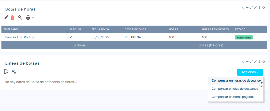 Nos aparece el módulo de líneas de bolsa vacío y debemos añadir líneas hasta saldar el total de horas y que la columna horas pendientes sea 0 o menor que cero, en ese momento el estado pasa de Pendiente a Compensado.