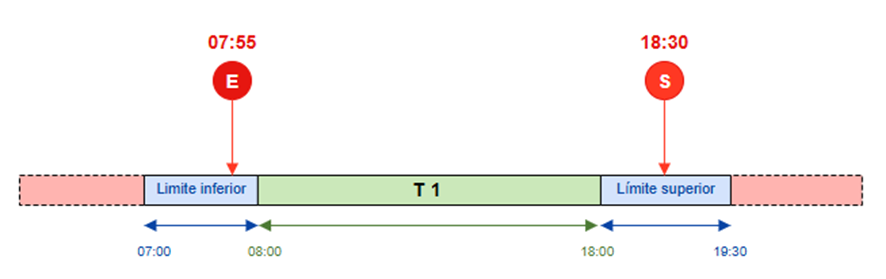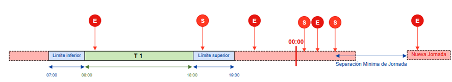 MaxJourneyHours). Este parámetro solo tiene efecto si su valor es mayor que cero. Si el tiempo transcurrido desde el primer fichaje de la jornada actual supera este valor y el fichaje actual es en una fecha diferente a la del inicio de la jornada, el sistema inferirá que se trata de una nueva jornada. Esto evita que jornadas excepcionalmente largas se extiendan indefinidamente a través de múltiples días si hay un corte lógico para crear una nueva jornada. Para los ejemplos de este documento tendremos configurado este parámetro a 12 horas.