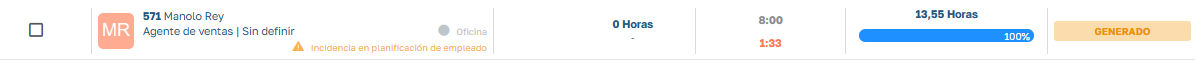 El sistema nos advertirá que existe una incidencia en la planificación del empleado ya que es un empleado que se espera que tenga un planificación y no la tiene. Además vemos que el tiempo previsto de jornada es 0 horas y con turno no asignado.