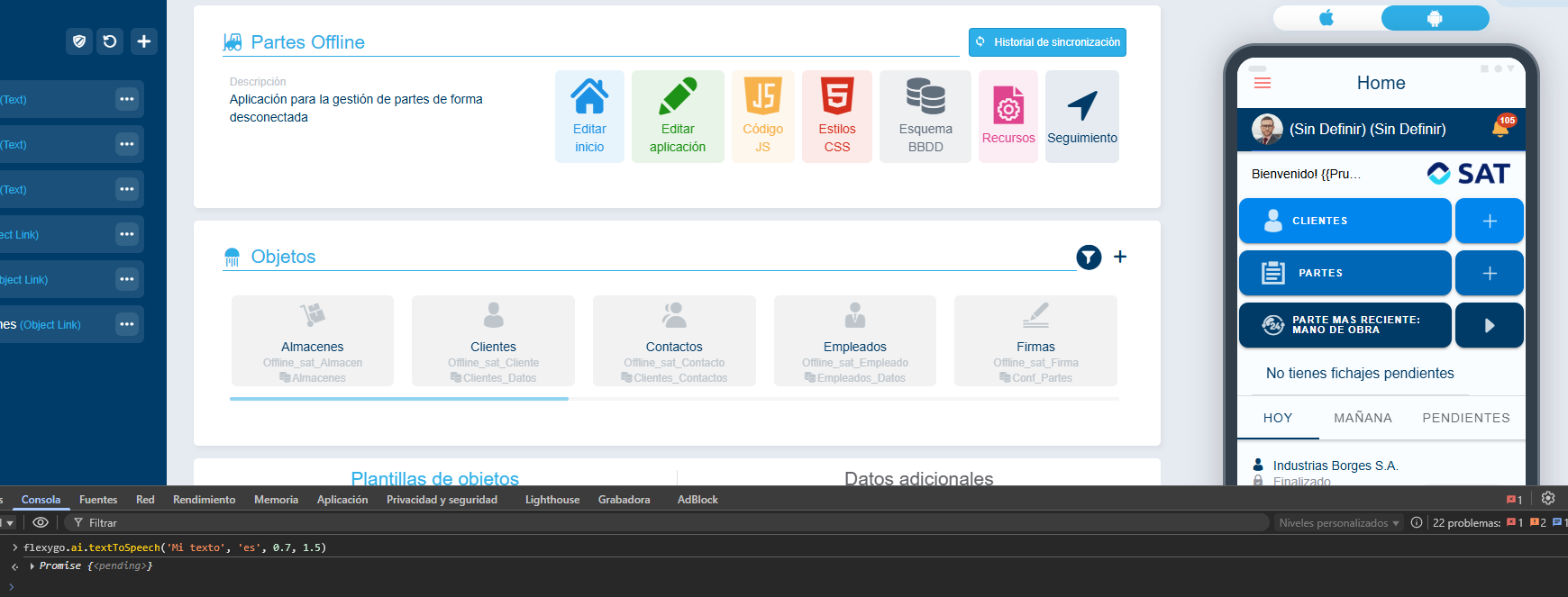 Con la función "flexygo.ai.textToSpeech" puedes indicarle el texto que quieras y esta leerá en voz alta este. Puedes configurarle el idioma, aunque de base escogerá el del usuario y además también puedes controlar tanto la velocidad con la que habla como su volumen.