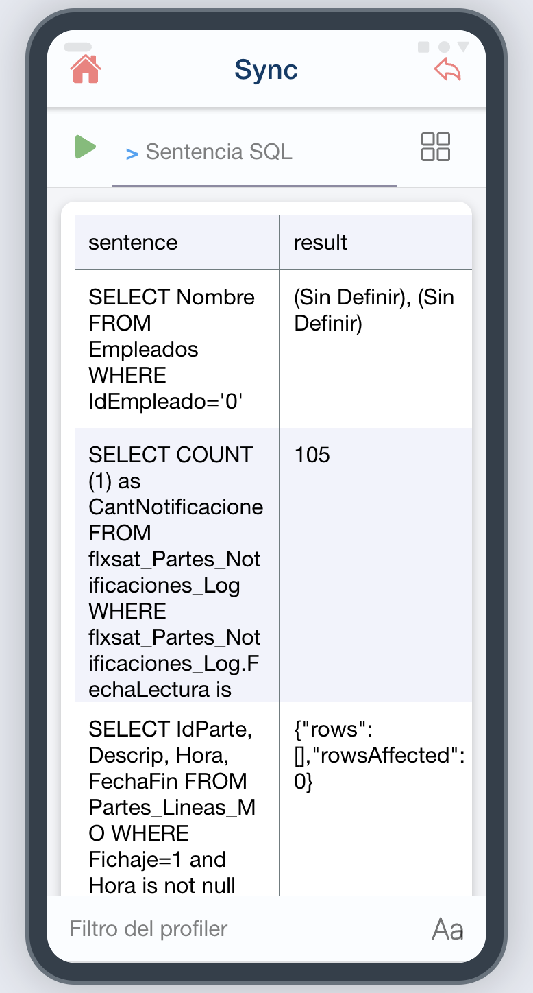 Para acceder al profiler de la app debes de ir al menú de base de datos, tras ello verás un botón verde cuando se pulsa todas las SQL ejecutadas y sus resultados comenzarán a ser registradas, por lo que deberás desplazarte a la pantalla que quieres analizar para que se registre las sentencias y sus resultados.
