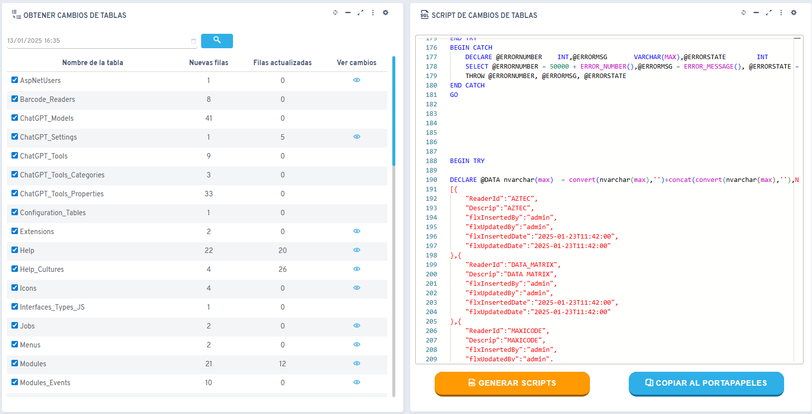 Desde el listado de objetos podemos acceder a la opción para obtener las modificaciones de las tablas de configuración. Al entrar, indicamos a partir de qué fecha queremos que se muestren los cambios, seleccionamos las tablas que deseamos revisar y generamos un script con todas las modificaciones realizadas. Este script nos permite visualizar, revisar y copiar fácilmente los cambios para su uso posterior.